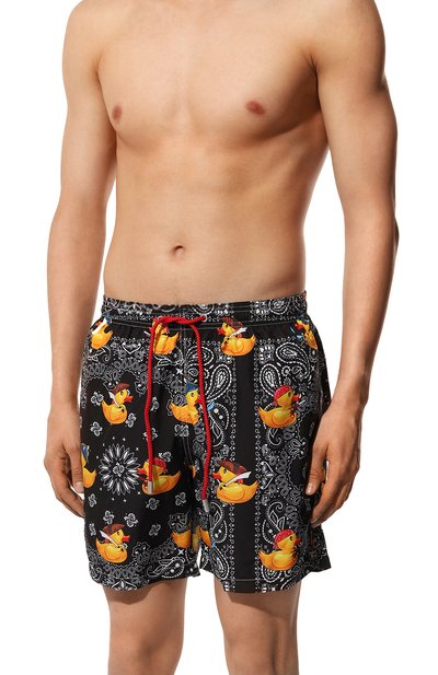 Плавки-шорты с подкладом из нейлона стрейч выполнили из полиэстера с брендированным принтом, будто частично стершимся со временем. Пояс-кулиску у изделия дополнили эластичной вставкой с логотипом, которому вторит символика марки на трех карманах с молниями.