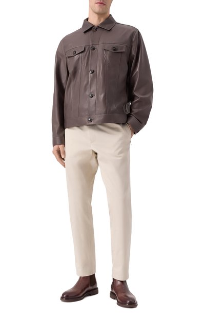 Куртку-рубашку с внутренним и двумя внешними карманами выполнили из мелкозернистой кожи. Модель с шелковым подкладом дополнили патами на поясе.