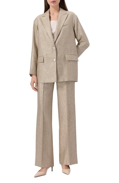 Для пошива жакета со шлицей сзади использовали лен с добавлением шерсти, полиэстера и нейлона. Модель с тремя карманами украсили фирменной цепочкой мониль, которую закрепили под воротником на спинке.