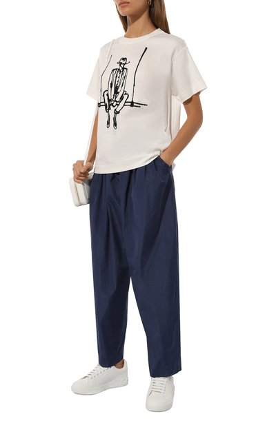 Брюки с отворотами и прошитыми стрелками выполнили из стрейчевого хлопкового трикотажа. Модель с регулируемым поясом-кулиской дополнили двумя боковыми карманами с кантом из фирменной цепочки мониль.
