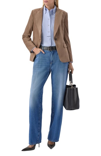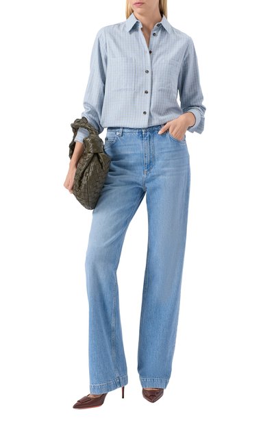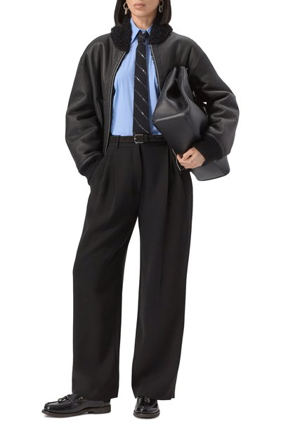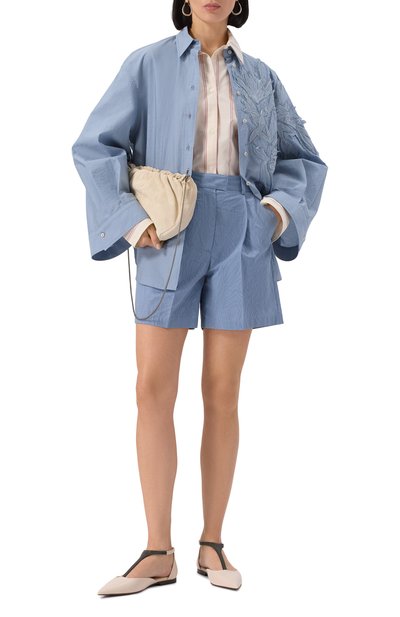 Рубашку с бантовой складкой на спинке, изготовленную из хлопкового поплина, дополнили съемным шарфом. Клапан нагрудного кармана oversize-модели украсили деталью, расшитой цепочкой мониль.