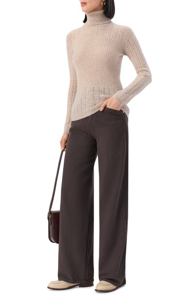 Слегка укороченные джинсы прямого кроя сшили из чистого хлопка. Боковые карманы модели укрепили брендированными заклепками, а один из задних украсили фирменной цепочкой мониль. На поясе изделия закрепили патч с эмблемой Solomeo.