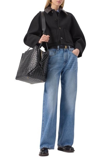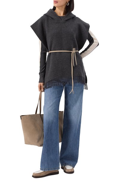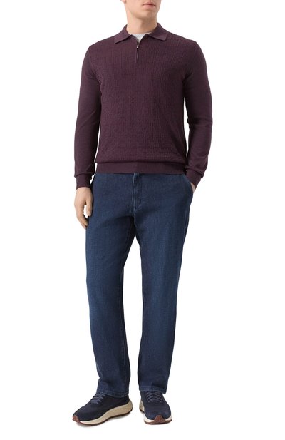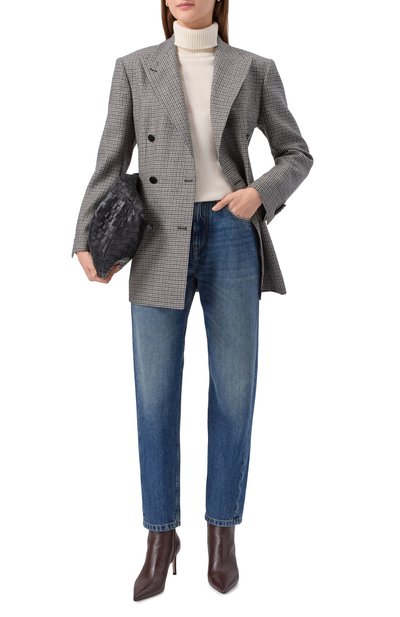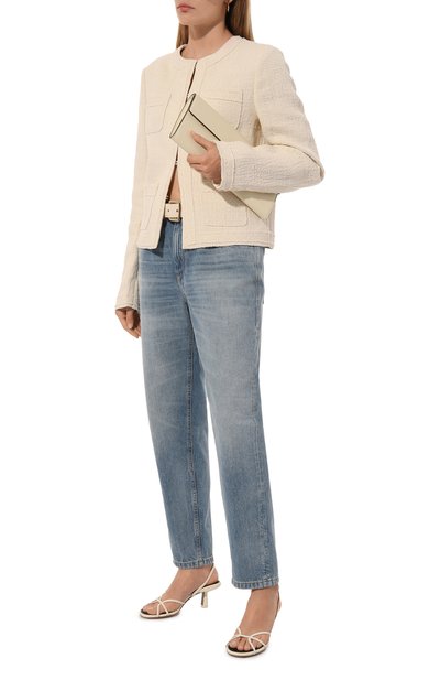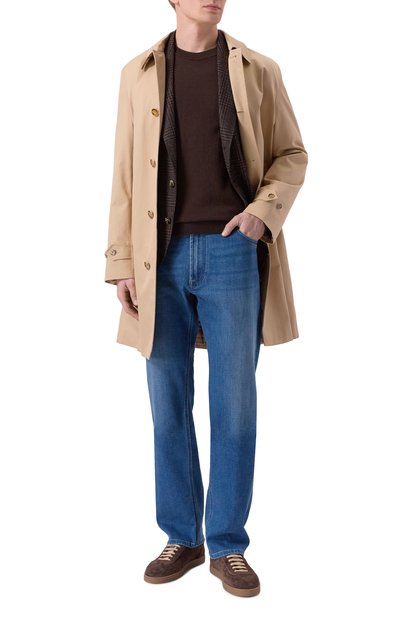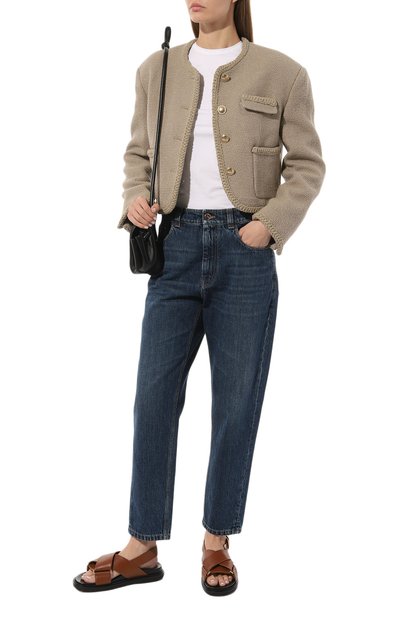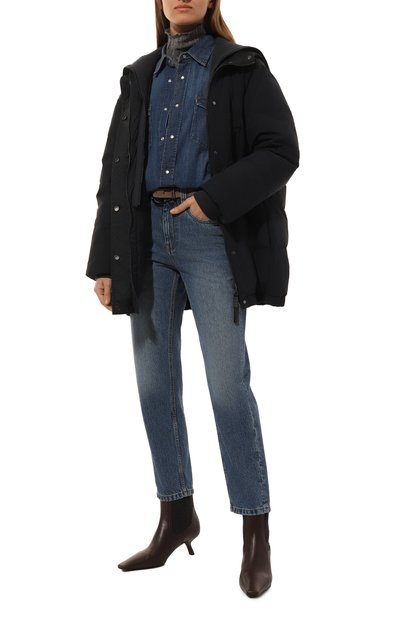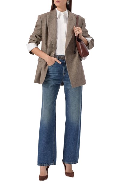 Джинсы с заломами и отутюженными стрелками сшили из хлопкового денима с добавлением эластана. Модель с брендированным патчем на поясе дополнили пятью карманами, а одну из шлевок декорировали фирменной цепочкой мониль.