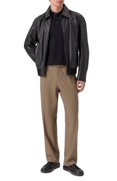 Бомбер Borello с воротником-стойкой выполнили из мягкой кожи. Модель с трикотажными манжетами и поясом в рубчик, боковыми и внутренним карманами застегивается молнией со шнуром на пуллере.