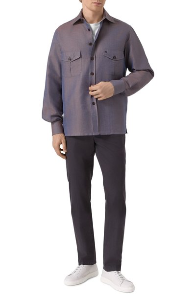 Куртку-рубашку Oleano выполнили из козьей замши, выделанной вручную. Модель, прямоугольные манжеты и клапаны нагрудных карманов застегиваются роговыми пуговицами.