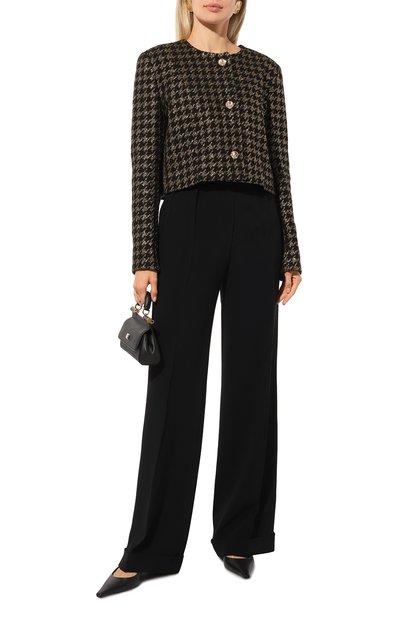 Брюки со складками спереди и двумя карманами застегиваются потайной молнией сбоку. Пояс модели, сшитой из тутового шелка, украсили двумя крупными пуговицами.
