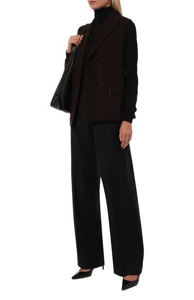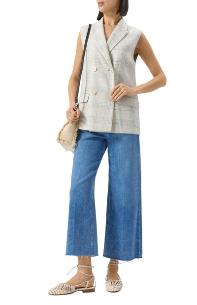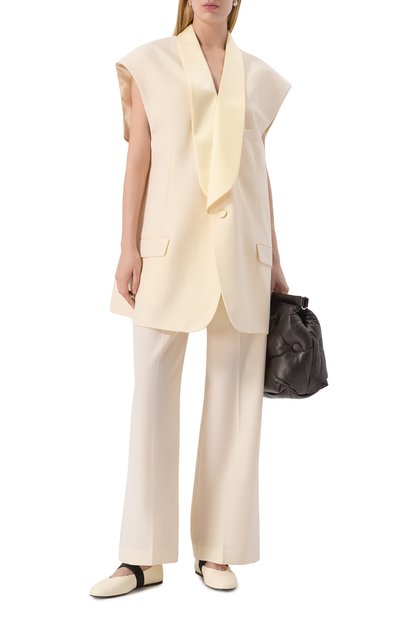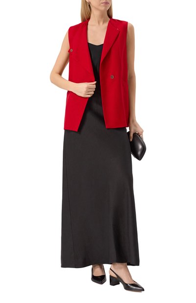 Двубортный жилет с глубокими проймами и широкими лацканами вошел в капсульную коллекцию Holiday. Для пошива приталенной модели с боковыми вставками в рубчик использовали стрейчевый трикотаж на основе шелка малберри.