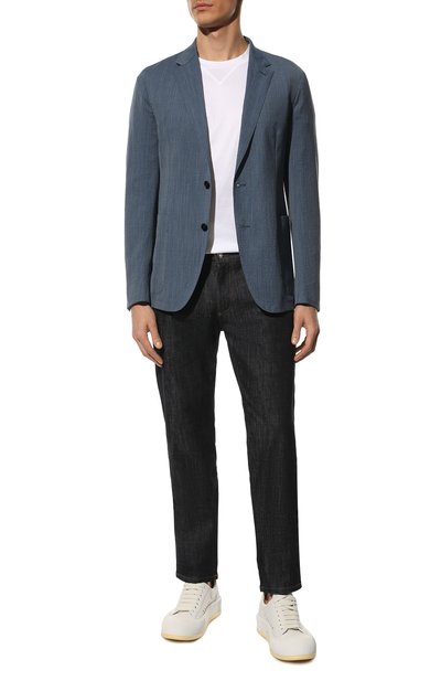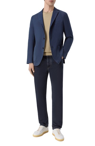 Пиджак с воротником-стойкой и шлицей сшит изо льна. Однобортная модель с внутренним и двумя внешними карманами составит гармоничный дуэт с парными брюками, поло и кедами.