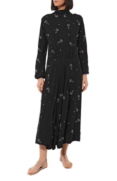 Платье с шалевыми лацканами, спущенной линией плеч и глубоким декольте выполнили из шелковой ткани. Модель дополнили узкой эластичной вставкой на талии.