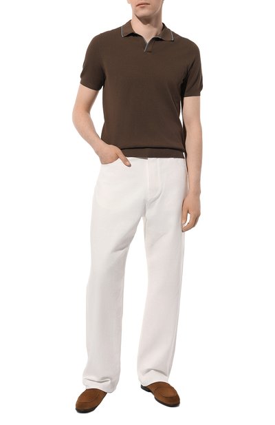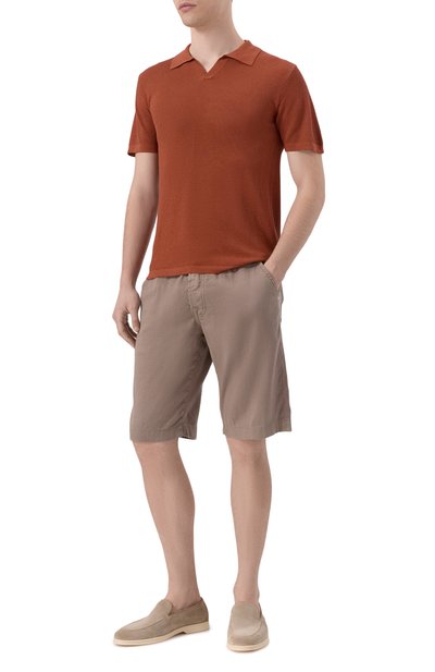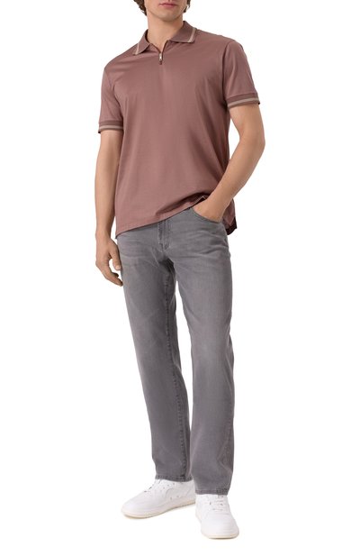 Поло с короткой пуговичной планкой выполнено из хлопкового трикотажа. Модель с манжетами и поясом в рубчик может стать основой образов разной степени сложности.