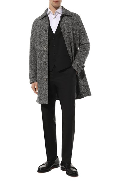Для пошива жилета Huge с парой прорезных карманов использовали ткань из шерсти первого пострига. Атласную спинку с жаккардовым паттерном из логотипов дополнили регулируемыми ремешками.