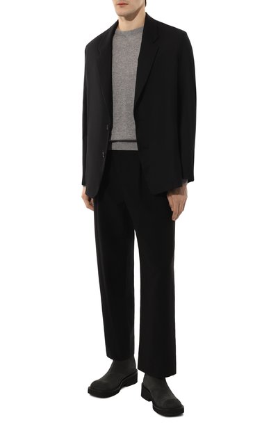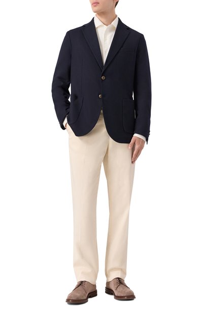 Для изготовления однобортного приталенного пиджака с двумя шлицами использовали фактурный стрейчевый материал из шерсти Super 120's. Модель дополнили прорезным нагрудным карманом, накладными боковыми и внутренним с пуговицей.