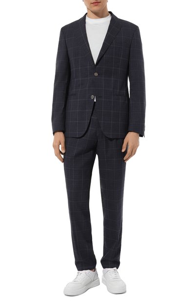 Костюм выполнили из микса п олиэстера и шерсти с добавлением эластана. Однобортный пиджак дополнили парой карманов по бокам и нагрудной листочкой. Еще два кармана и пару листочек предусмотрели на брюках со средней посадкой.