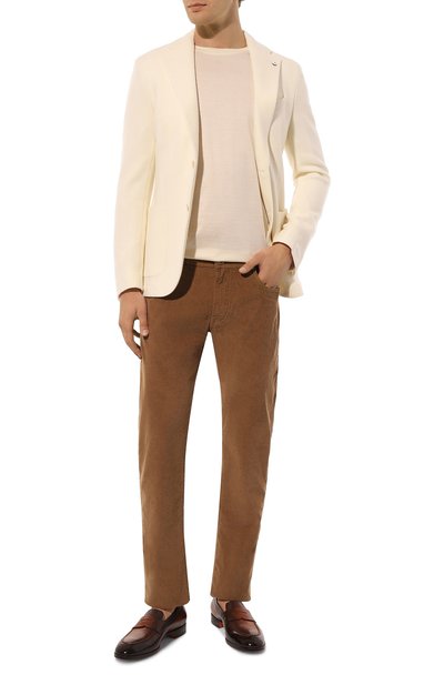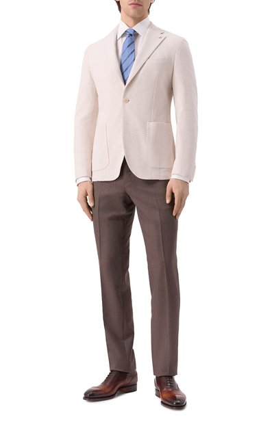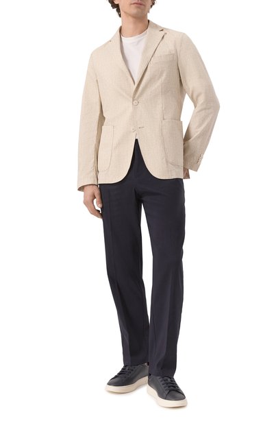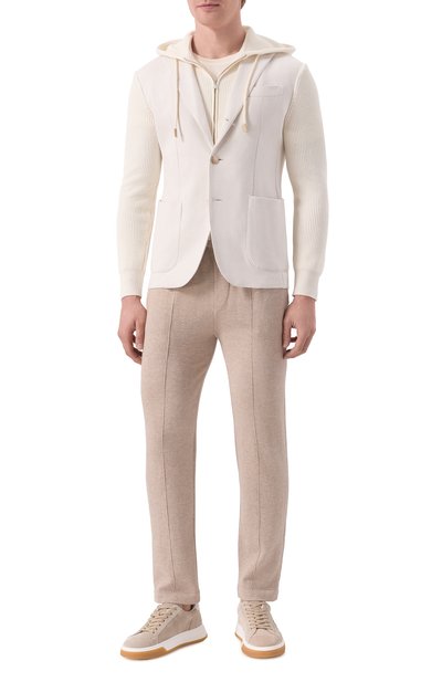Для изготовления однобортного пиджака с тремя внешними и внутренним карманами использовали хлопковый трикотаж стрейч, усиленный полиамидом. Модель дополнили съемным нагрудником с регулируемым капюшоном.