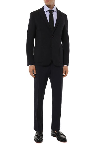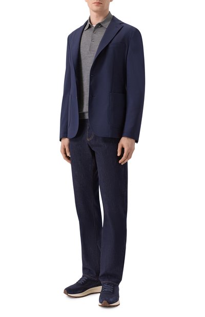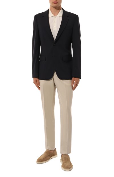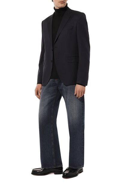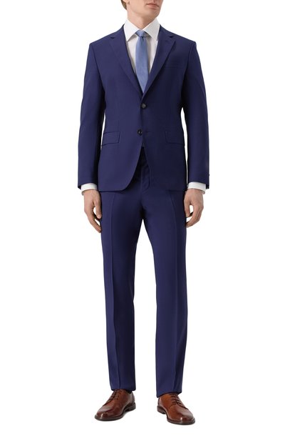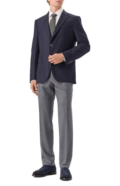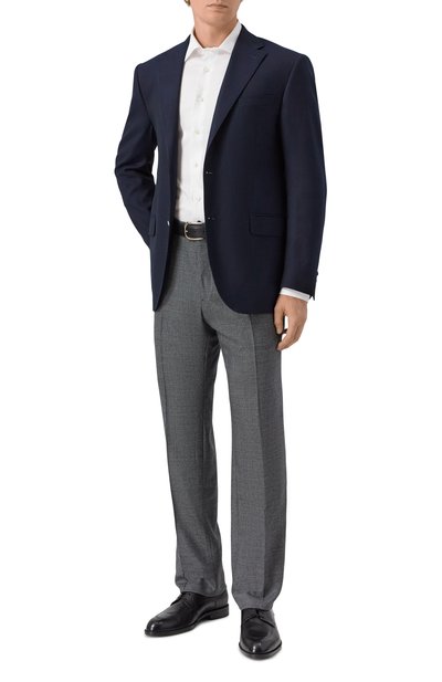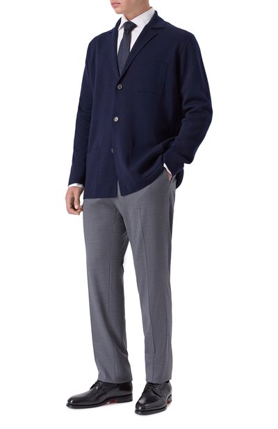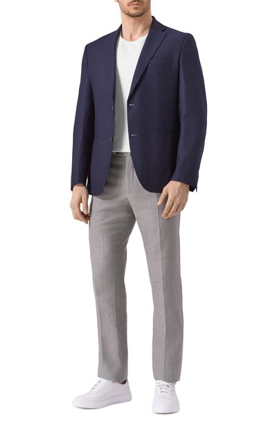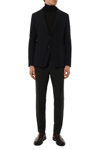 Приталенный однобортный пиджак с двумя шлицами выполнили из стрейчевого материала на основе шерсти с добавлением хлопка. Модель дополнили прорезным нагрудным карманом и накладными боковыми.