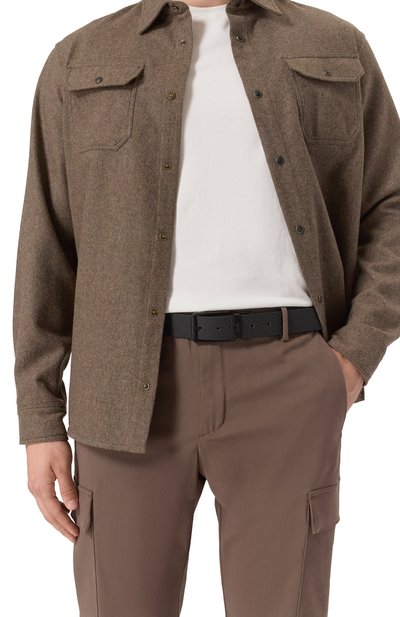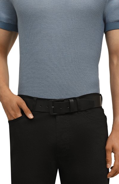 Ремень с фиксированной шлевкой выполнили из кожи. Аксессуар с брендированной пряжкой украсили крупным логотипом, расположив его на конце с отверстиями.