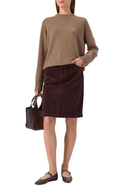 Миди-юбку прямого кроя выполнили из денима. Модель с высокими разрезами спереди и сзади и брендированным патчем на поясе дополнили диагональными боковыми карманами.