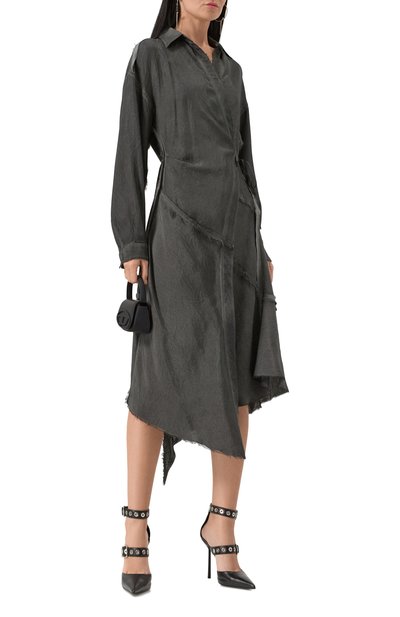 Джинсовое платье-рубашку с фигурной кокеткой сшили из хлопкового денима с потертостями. Приталенное изделие с разрезами по бокам дополнили четырьмя карманами и широким поясом-лентой.