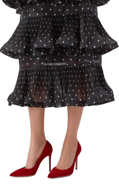 Туфли-лодочки Gianvito на шпильке средней для этой линии высоты выполнили из лакированной наппы. Принадлежность пары с зауженным мысом марке обозначили фольгированным логотипом на стельке.