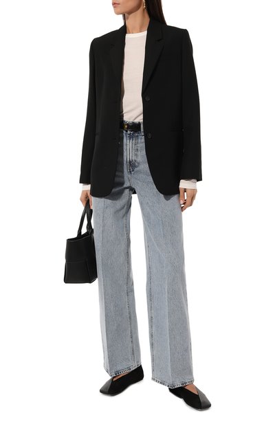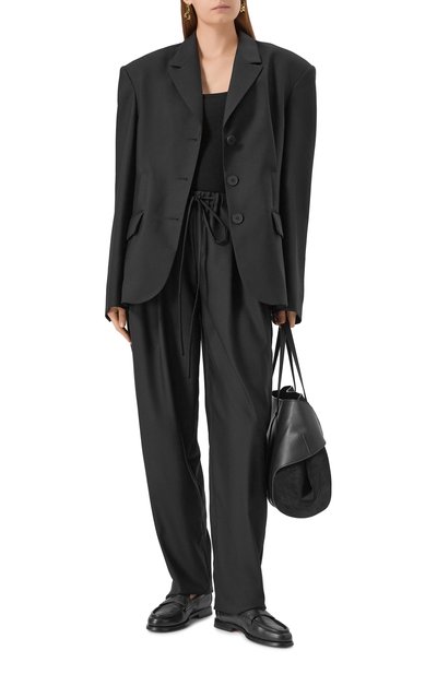 Жакет с двумя шлицами сзади выполнили изо льна, а для подкладки использовали шелковый атлас. Модель с тремя прорезными карманами застегивается парой крупных пуговиц.