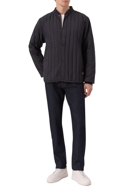 Стеганый бомбер Banja Liner с манжетами и воротником-стойкой из трикотажа в рубчик выполнили из нейлона с влагоотталкивающим покрытием. Модель на кнопках дополнили боковыми карманами с молниями.