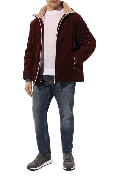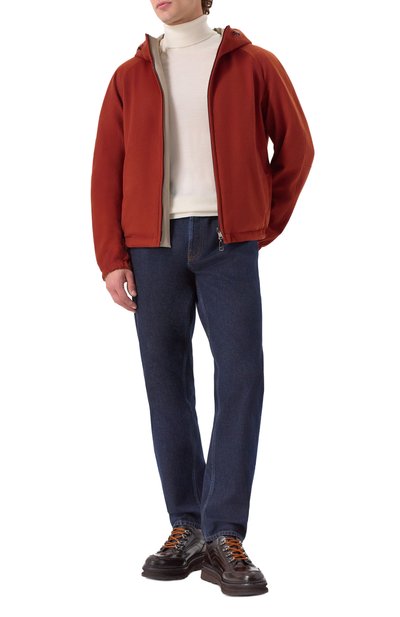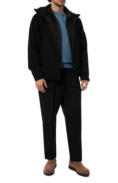 Куртку с боковыми карманами выполнили из японской водоотталкивающей микрофибры. Модель с проклеенными термолентами швами и эластичными манжетами на рукавах реглан дополнили кулисками внизу и на высоком воротнике-стойке со скрытым капюшоном.