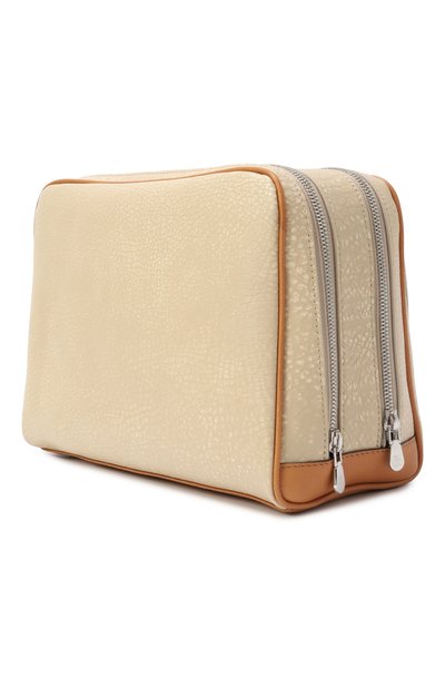Несессер с подкладкой из водоотталкивающей ткани выполнили из матовой телячьей кожи. Модель с тисненым логотипом марки спереди закрывается круговой молнией с брендированным пуллером.