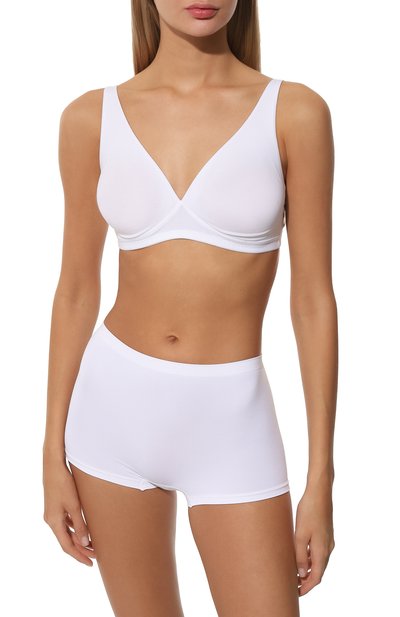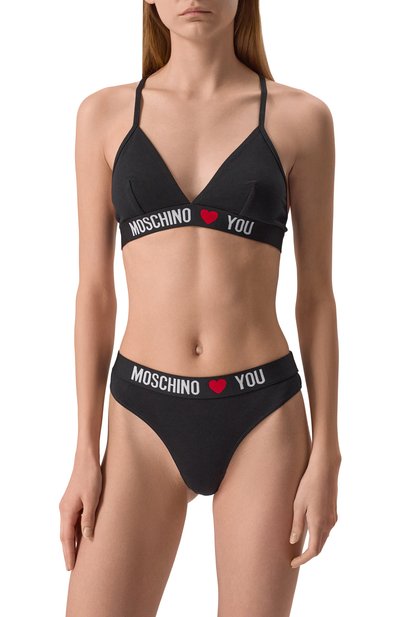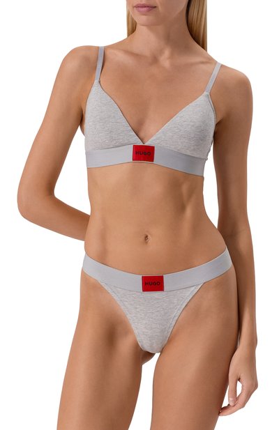 Бюстгальтер с треугольными чашечками и регулируемыми перекрещивающимися бретелями выполнили из эластичного хлопка. О принадлежности белья марке рассказали брендированным поясом-резинкой на двух крючках с тремя вариантами объема.