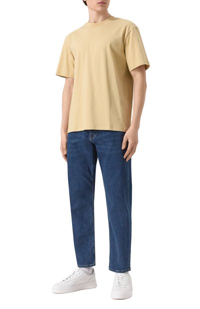 Слегка выбеленные джинсы с пятью карманами сшили из эластичного хлопкового денима. Брюки украсили фирменным ярлыком спереди и жакроном с контрастным логотипом на поясе.
