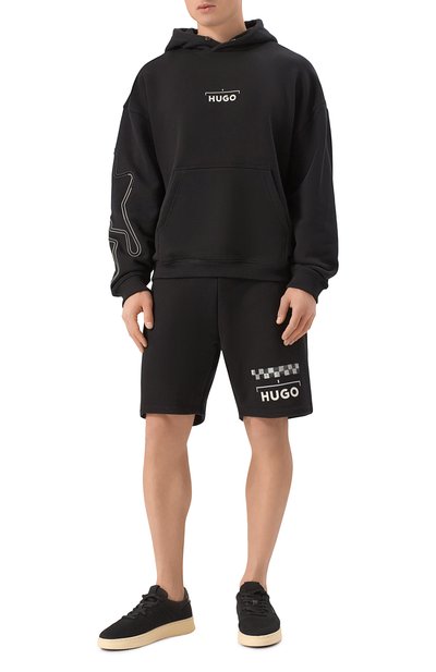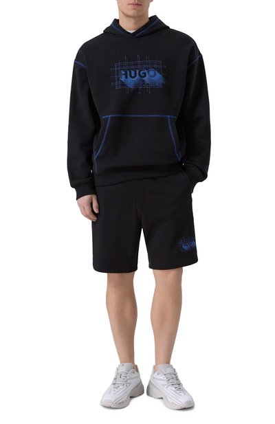 Шорты с широким поясом-кулиской сшиты из хлопкового трикотажа. Эластичная модель с накладным и двумя врезными карманами украшена крупным брендированным принтом сбоку.