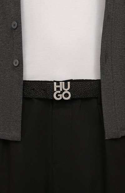 Ремень стандартной ширины изготовили из кожи с тисненым брендированным паттерном. Аксессуар со строчками фирменного алого оттенка застегивается прямоугольной пряжкой с выгравированным логотипом марки.