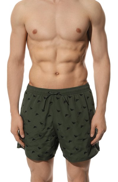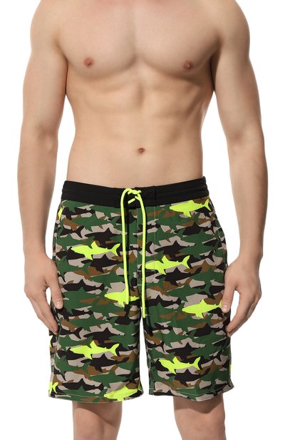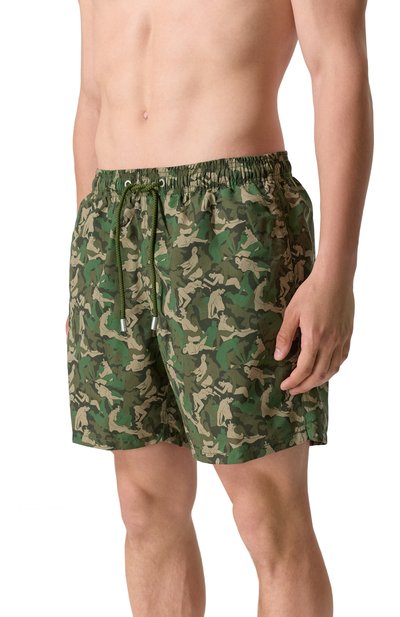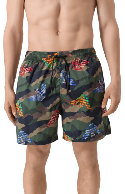 Плавки-шорты с подкладкой из стрейчевой сетки выполнили из нейлона с камуфляжным узором. Спереди модель украсили брендированной нашивкой и эмблемой, вдохновленной символикой ВВС Италии. Под эластичным поясом-кулиской сзади и на одном из трех карманов, который дополнили этикеткой, разместили люверсы.