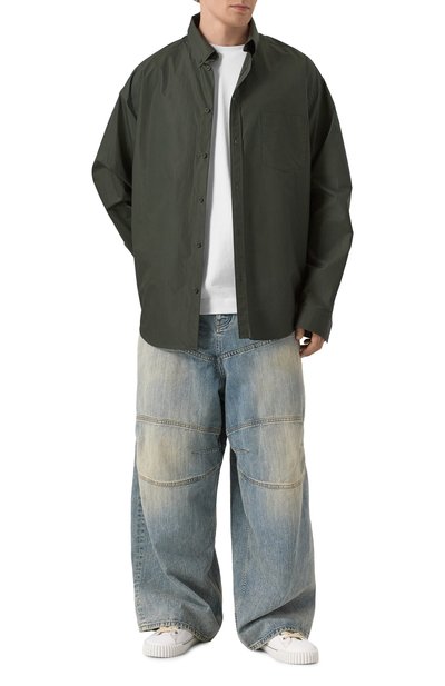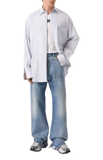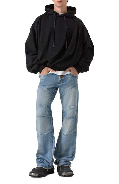 Джинсы baggy с выбеленностями и потертостями выполнили из хлопкового денима. Спереди модель с пятью карманами украсили вышитым логотипом марки, а пояс изделия сзади дополнили брендированным патчем.