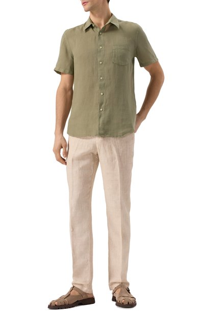 Рубашку с супатной застежкой выполнили из хлопкового муслина. Модель с двумя небольшими боковыми разрезами дополнили парой нагрудных карманов, на одном из которых — логотип бренда.