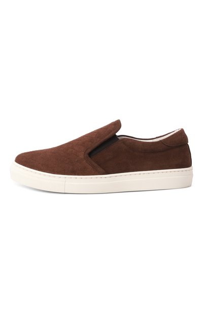 Для пошива слипонов, отделанных внутри овчиной, использовали замшу. Модель с круглым мысом и мокасиновым швом установили на широкую резиновую подошву.