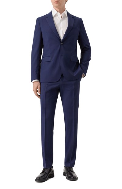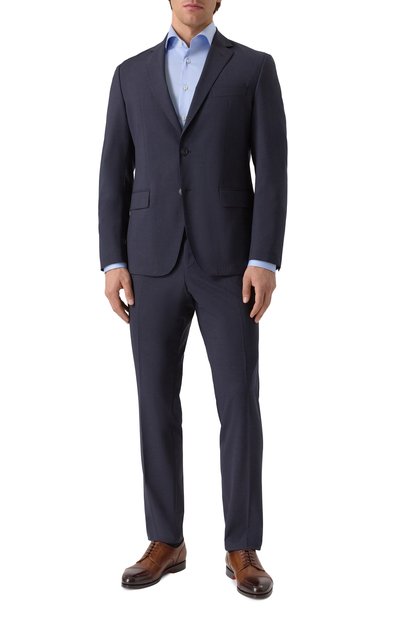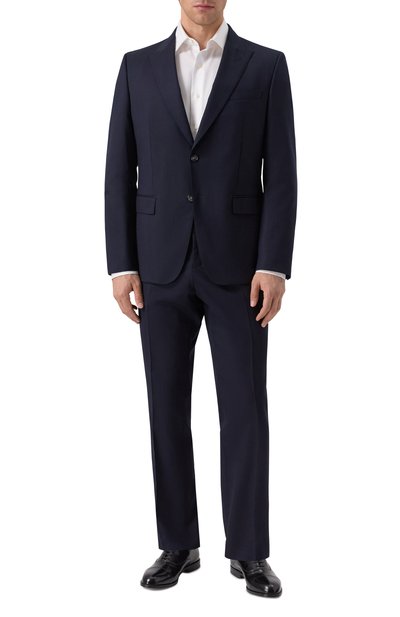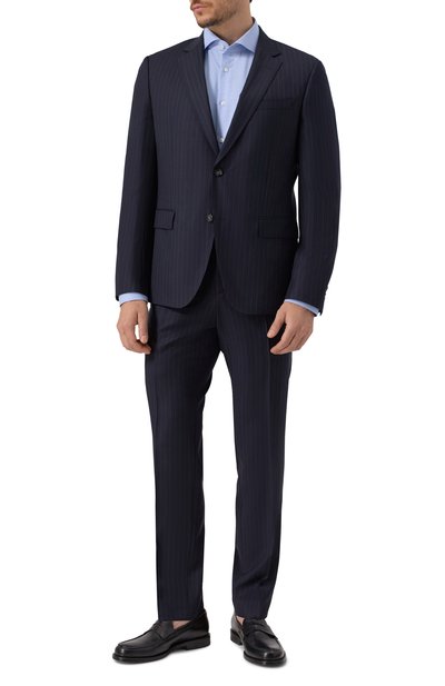 Костюм-двойку выполнили из тонкой шерстяной ткани в едва заметную полоску. Однобортный полуприталенный пиджак с двумя шлицами дополнили внутренним и тремя внешними карманами, а брюки со стрелками – боковыми и задними.
