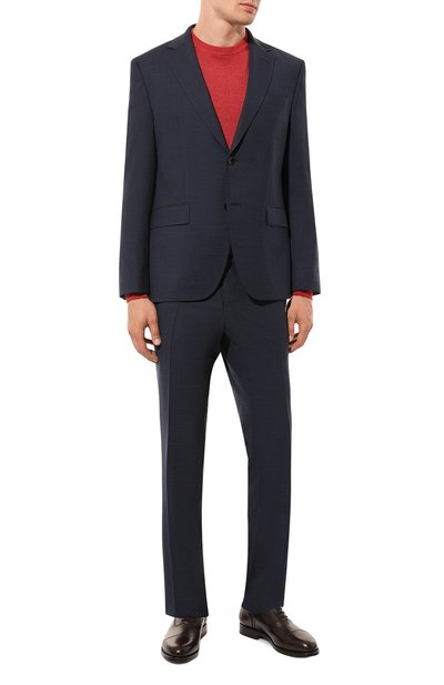 Костюм-двойку выполнили из тонкой шерстяной ткани в едва заметную полоску. Однобортный полуприталенный пиджак с двумя шлицами дополнили внутренним и тремя внешними карманами, а брюки со стрелками – боковыми и задними.