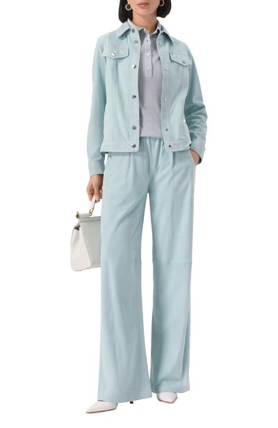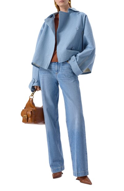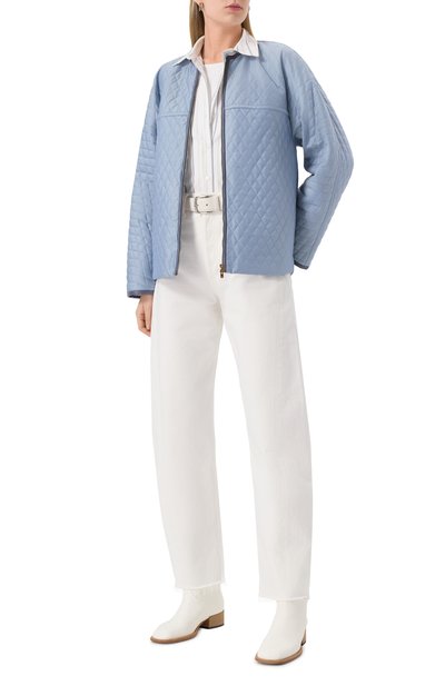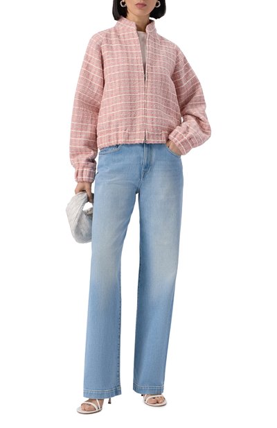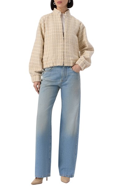 Для пошива бомбера на встречной молнии выбрали смесовый твид с добавлением металлизированных нитей. Модель на шелковистом подкладе в тон дополнили боковыми карманами с листочками.