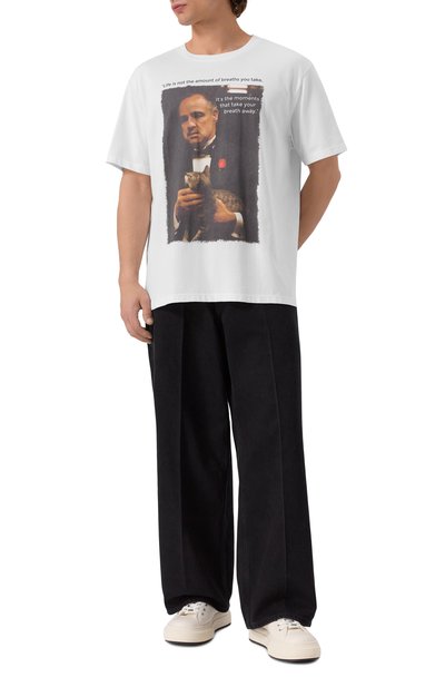 Прямую футболку выполнили из хлопкового джерси. Спереди модель украсили принтом-фотографией Брижит Бардо, словно зафиксировав снимок клейкими лентами.