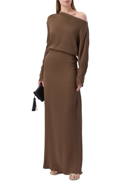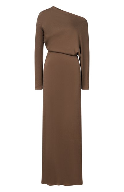 Шелковое миди-платье в виде знакового для марки тренча дополнили широкой пелериной с погонами и фирменной пряжкой на воротнике-стойке. Талию модели подчеркнули несъемным поясом-лентой, а сзади на расклешенном подоле предусмотрели шлицу.