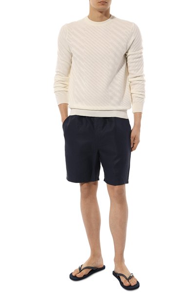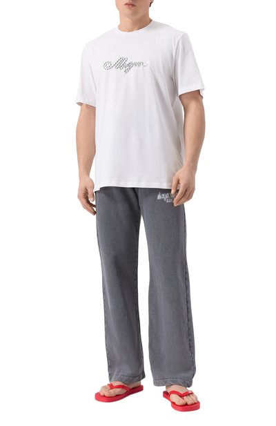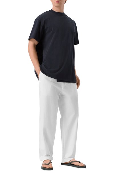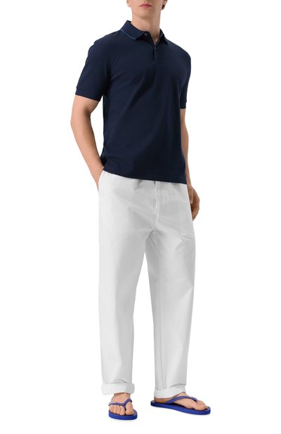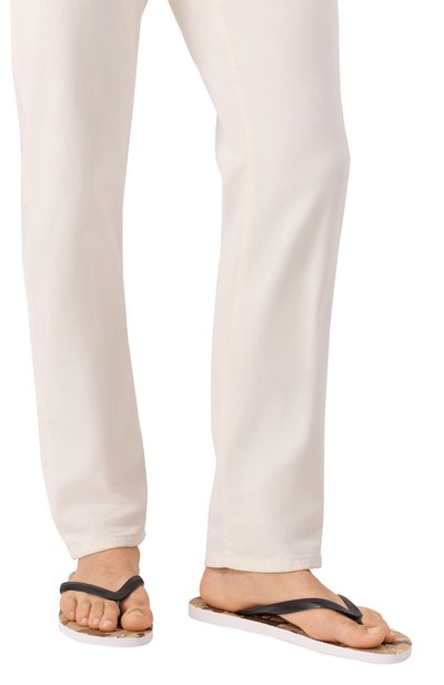Шлепанцы с Y-образной перемычкой выполнили из полимера. Полосатую стельку модели украсили фирменной эмблемой.