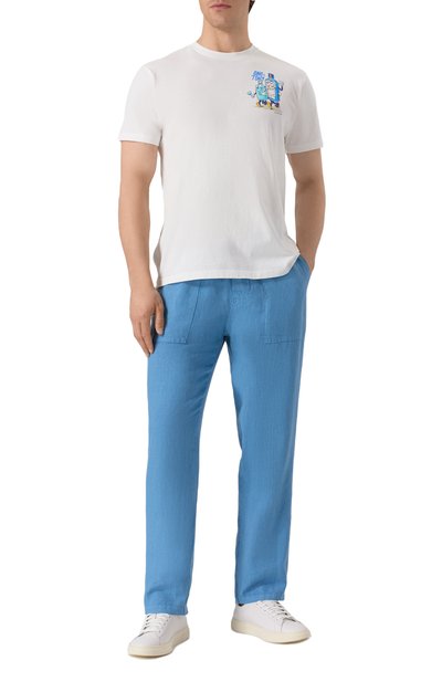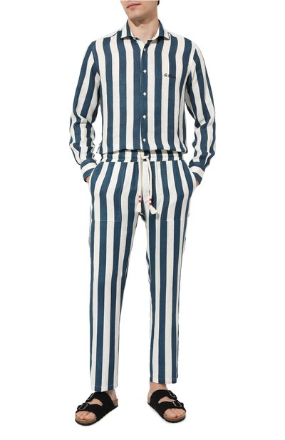 Прямые брюки Calais с двумя парами карманов выполнили изо льна в вертикальную полоску. В эластичный пояс-кулиску с брендированной нашивкой сзади продели плетеный шнур с кисточками и отделкой в цветах фирменного ярлыка.