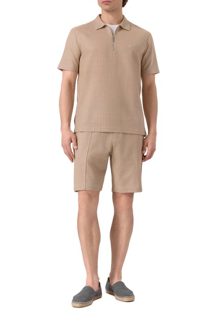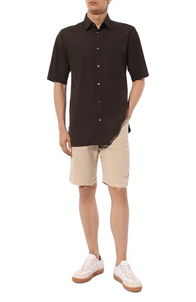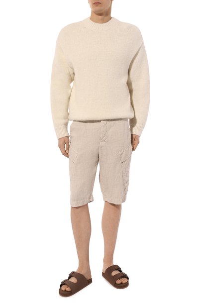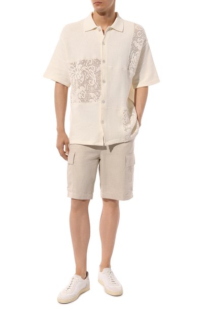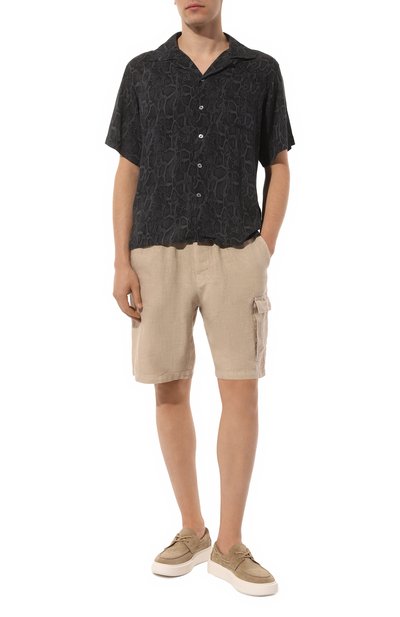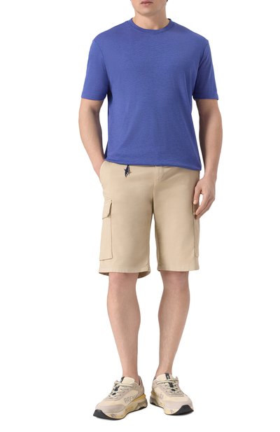 Шорты Marseille изо льна дополнены четырьмя врезными карманами и одним карго с вышитым логотипом марки. Эластичный пояс-кулиска с витым шнуром украшен брендированным патчем.