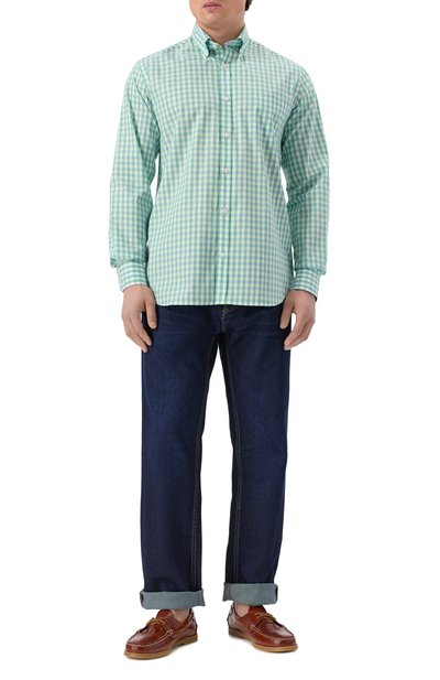 Рубашку Pamplona с закругленным подолом сшили из дышащего льна в полоску. Модель, застегивающаяся брендированными пуговицами, может стать основой непринужденного образа с шортами, футболкой и эспадрильями.