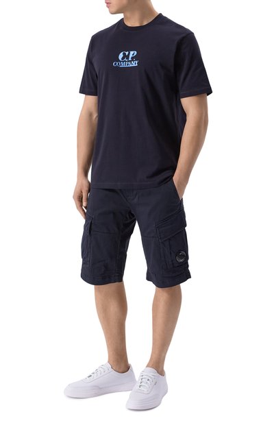 Для пошива футболки с фирменными принтами спереди и сзади использовали хлопковое джерси. Левый рукав украсили вышитым логотипом марки, а круглую горловину — двухцветным ярлыком.