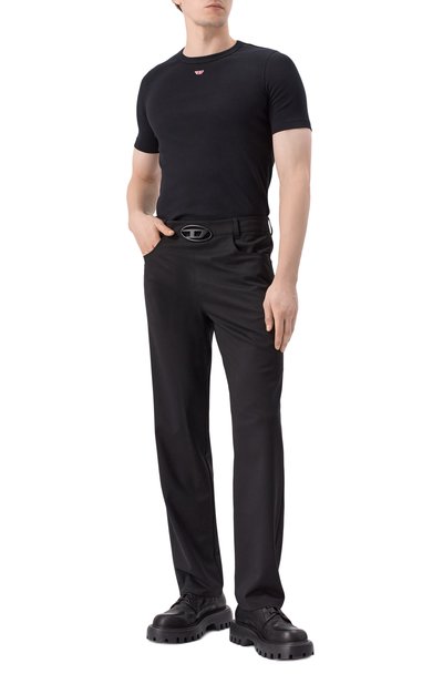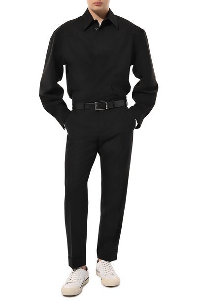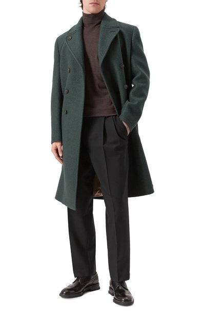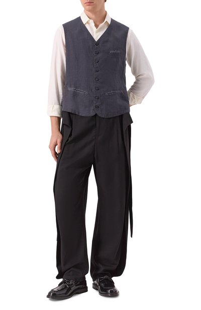 Для пошива широких брюк с драпировками на коленях использовали обработанную озоном ткань tropical из тонкой шерсти super 120’s. Модель с эластичной вставкой на поясе дополнили боковыми и задними карманами с клапанами.