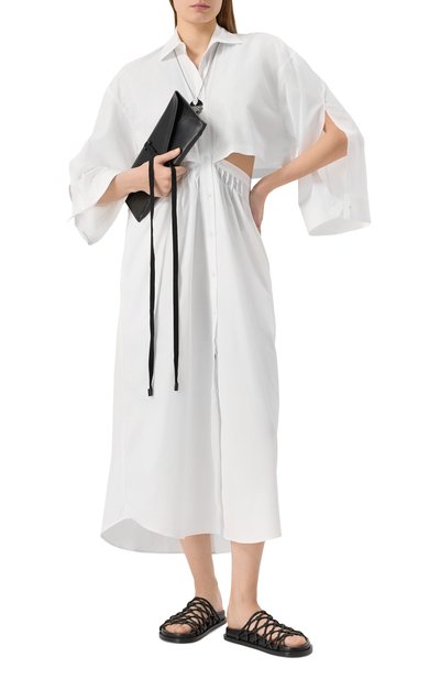 Платье-рубашку Tatiana с перламутровыми пуговицами выполнили из хлопка с вышивкой Broderie anglaise. Модель с V-образной горловиной и широкой оборкой на подоле дополнили двумя боковыми карманами.