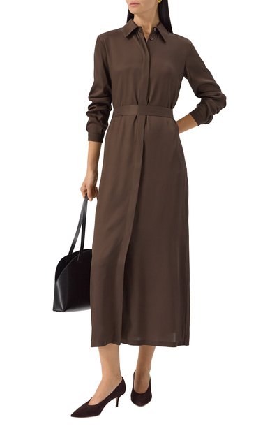 Приталенное платье-рубашку с широкими клиньями на подоле сшили из хлопкового поплина. Все пуговицы, кроме верхней, скрыли узкой планкой. В комплекте — ремень в тон с золотистой пряжкой.