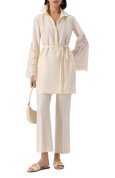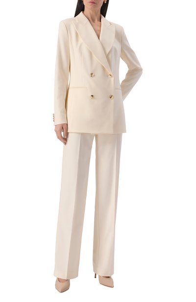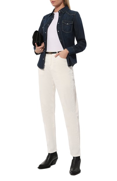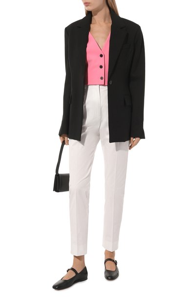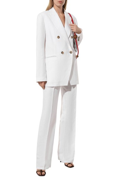 Брюки Siamese с двойными защипами, которые переходят в отутюженные стрелки, выполнили из льняной ткани. Модель с карманами по бокам дополнили регулируемым ремнем с металлической пряжкой фастекс.