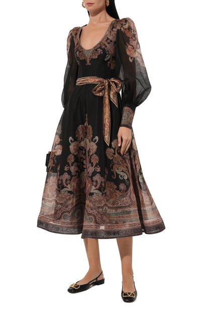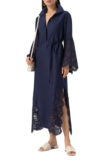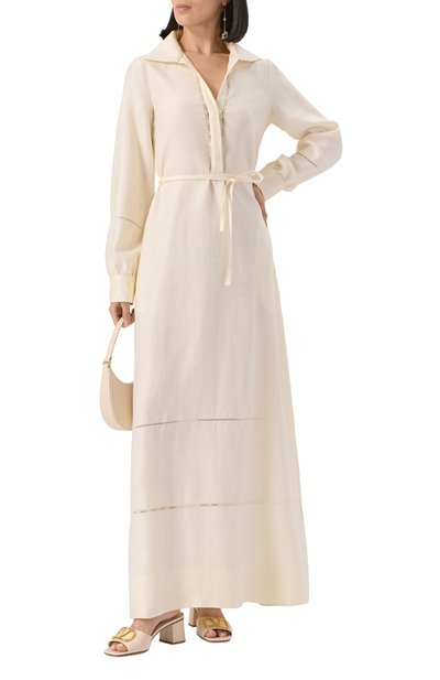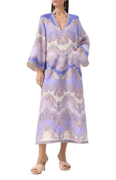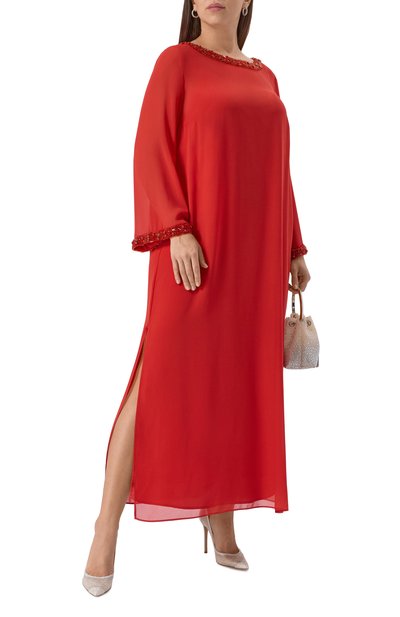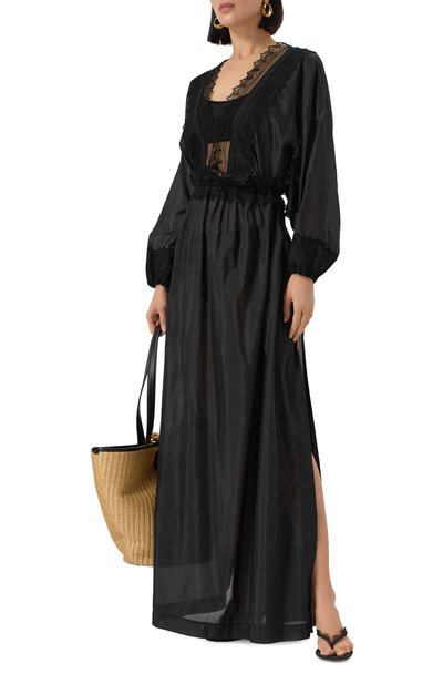Свободное платье-кейп Smirne с вертикальными оборками выполнили из шелкового жоржета. Глубокий V-образный вырез у изделия сзади дополнили перемычками. В комплект включили нижнее платье из вискозы.